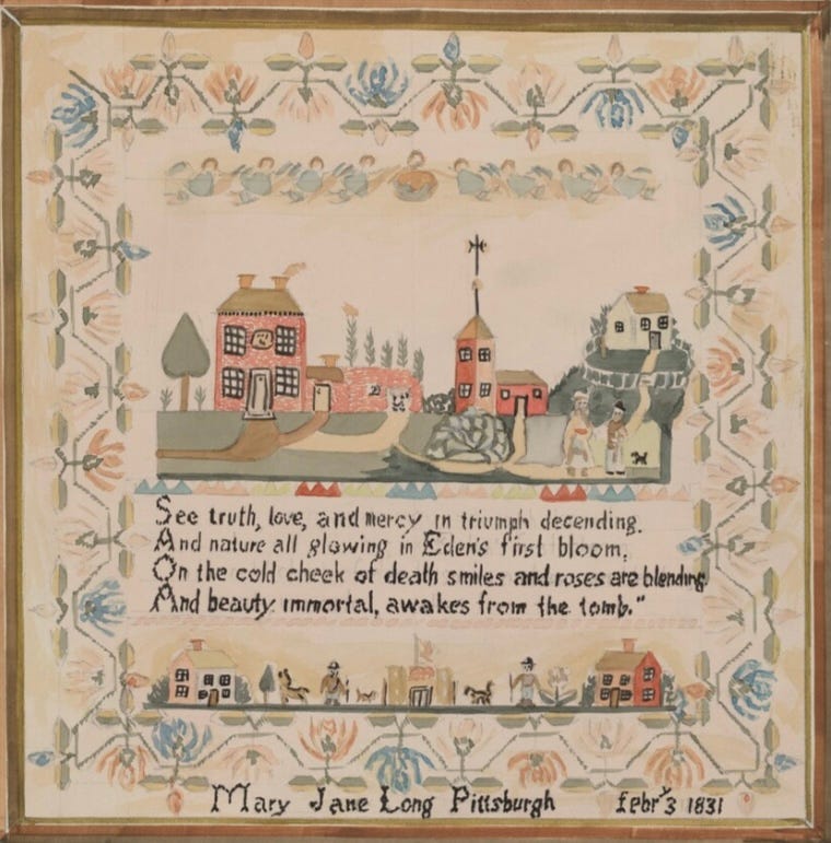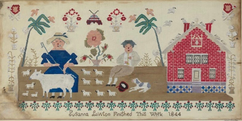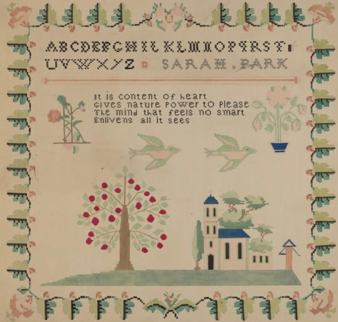 I’ve come across writers on Substack who present a variety of forms - prose, poetry, essays. Their writing reminds me of a sampler that includes a mixture of words, verses, and figures. When I come across someone who is focused on writing long-form serial fiction or releasing a novel by chapters, it reminds me of the sampler that presents a composed image.
